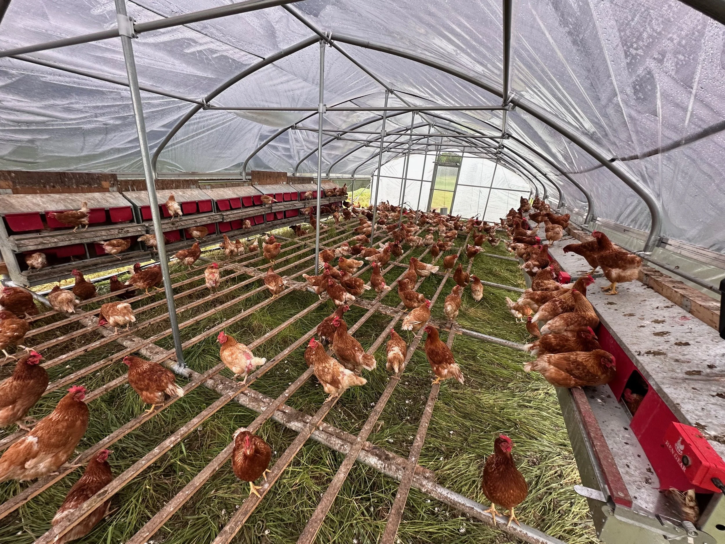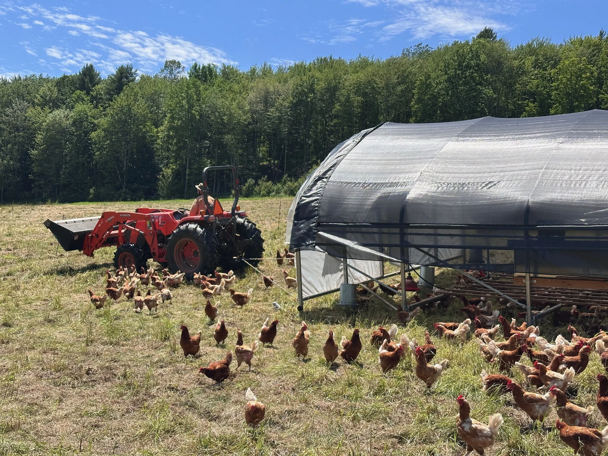 The mobile chicken coop was upgraded in 2025 to increase the efficiency of our pasture management. It holds 800 hens, and we move it twice weekly to bring the girls onto fresh pasture. Thanks to the State of Vermont’s Working Lands Enterprise Grant program for helping us make this capital upgrade.